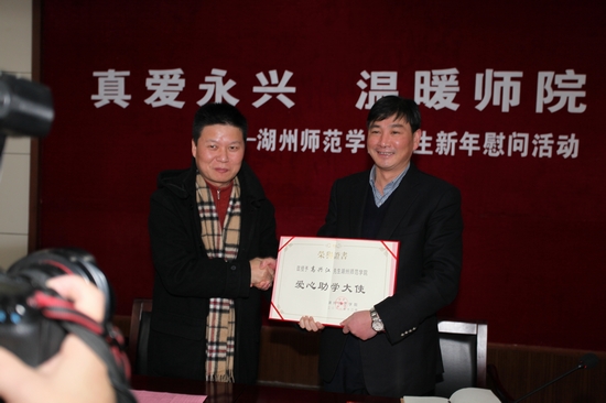 慰问活动中,高兴江为34名生活需特殊关注学生发放了爱心红包,表达了永兴人对火博(中国)学子的关爱之心。周家健为高兴江颁发了“爱心大使”荣誉证书。