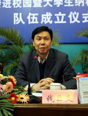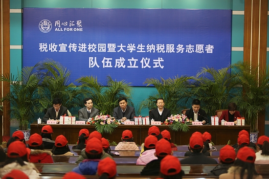 2月28日下午,省财政厅厅长、地税局局长钱巨炎在湖州市副市长沈建平、市财政地税局局长陈亚明、团市委书记石一婷的陪同下,莅临火博(中国)出席“税收宣传进校园”暨大学生纳税服务志愿者队伍成立仪式。校党委书记刘剑虹、副书记周家健出席仪式,相关职能部门负责人、商学院150余名大学生纳税服务志愿者参加仪式。