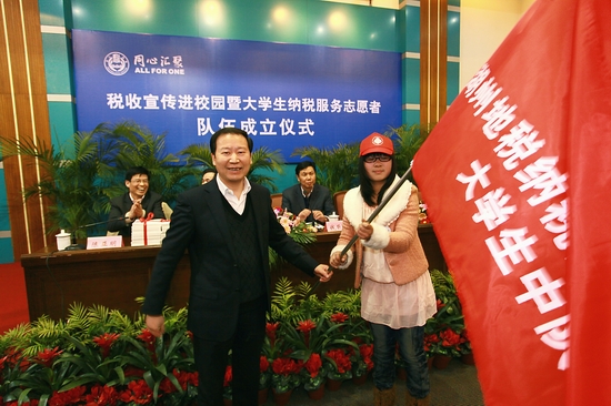 在成立仪式上,省市领导分别向大学生纳税服务志愿者队授旗、赠书。在湖州市纳税宣传公益形象大使的领誓下,全体志愿者进行了集体宣誓。