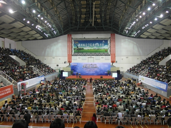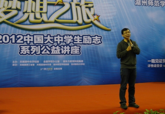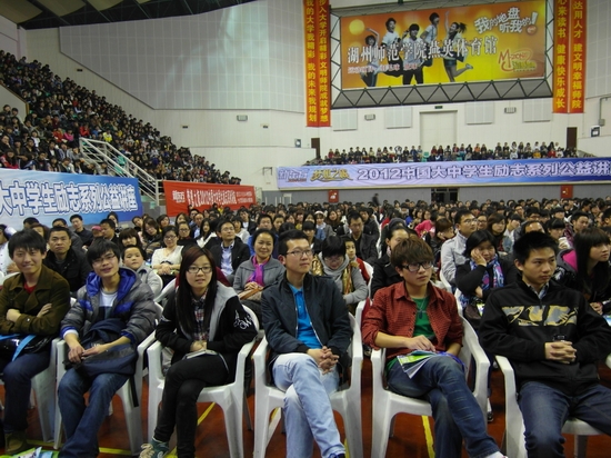 原定六点半开始的讲座,六点钟整个体育馆已座无虚席。杭州新东方进修学校校长吕伟胜在师生们的热烈欢呼中首先登台,在表达了对湖州的喜爱之情后,对现今大学生普遍存在的“迷茫”问题进行了深刻的阐述。他提出,人生三大悲剧莫过于不会选择、不断选择与不坚持选择,并鼓励大家无论做出什么样的选择都不要后悔,“看不清未来,就做好现在。”