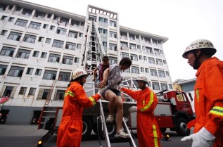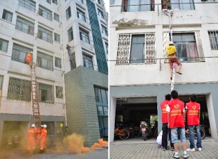 在滚滚浓烟的演练现场,笔者看到六层高的宿舍楼内呼救声、呐喊声一片,一群身穿红色马甲的消防志愿者在混乱中十分抢眼,尤其是在叫喊声四起中显得格外镇静,有利用校园广播系统指导学生疏散的、有手提灭火器迅速跑上楼层进行灭火扑救的、还有引导宿舍内学生有序逃生的。而消防官兵到场后并没有像以往那样迅速开展灭火扑救和人员搜救工作,而是协助志愿者对疏散到地面的学生进行集合整队。学生们从公寓楼的两个疏散楼梯紧急撤离、疏散,消防志愿者还组织大家从建筑内部和窗户等进行逃生,同时利用缓降器、软梯等实施救人,场面格外引人注目。整个演练活动持续了15分钟,600多名正在宿舍内进行午间休息的学生全部逃离至安全地带。除去6楼的100名学生通过消防云梯车疏散至地面外,其他学生均为自行疏散或被消防志愿者引导获救,先后有近150名学生分别通过绳结下滑、缓降器垂降等自救方式进行逃生。