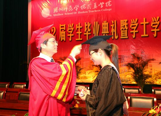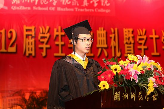 求真学院董事长、院长胡璋剑在临别赠言中寄语毕业生们三句话:得意之时请多一分淡定和警醒;困难之时请多一分坚持和自信;面对社会请多一分善意和责任。胡璋剑为学士学位获得者代表颁发学位证书,并一一拨穗正冠。