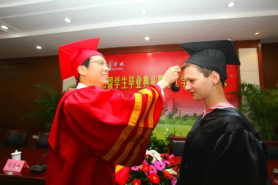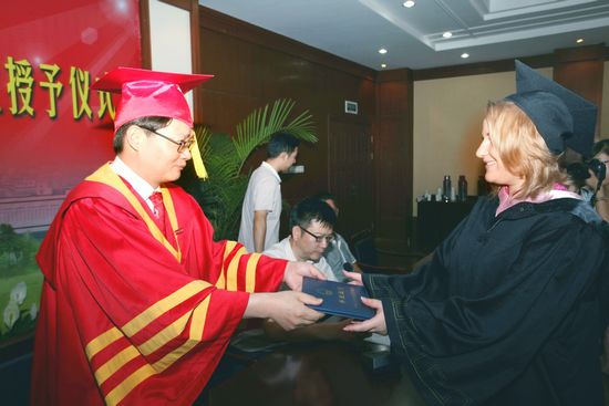 仪式上,胡璋剑与毕业留学生亲切交谈,颁发学位证书,拨穗正冠。蒋云良为毕业留学生颁发毕业证书。