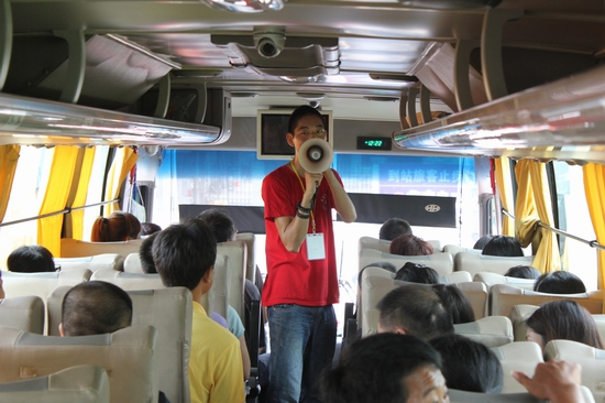 车站迎新有序,接送车内气氛也不减。为了让家长与学生提前了解学校相关信息,迎新人员除了为新生和家长分发校报、宣传单等,车内的讲解员也会随行介绍学校的情况。来自文学院的黄同学告诉记者,在车上她不仅为大家介绍学校的概况、入学的基本知识,而且介绍湖州的景点、小吃等等,并现场回答家长与学生的提问。一刻不停地讲解让她的喉咙略显沙哑,只能靠不断喝水来缓解。她说:“我觉得这是一件很有意义的事,付出再多也是值得的,累并快乐着。”