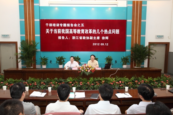 9月12日下午,浙江省政协副主席徐辉应邀莅校,作“火博登陆平台当前我国高等教育改革的几个热点问题”干部培训专题报告。校党政领导班子成员,中层干部、部分管理干部等一起聆听了报告。报告会由校党委书记刘剑虹主持。