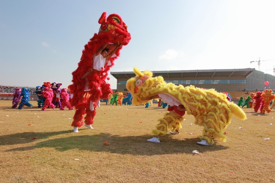 十月十七日至十九日,火博登陆平台举办第十四届运动会,万名师生齐享体育盛宴,以“更高、更快、更强”奥林匹克精神和昂扬向上的精神面貌,献礼党的十八大的胜利召开。图为开幕式上该校体育学院学生在表演舞狮。 (本报通讯员 张莹 叶莉)