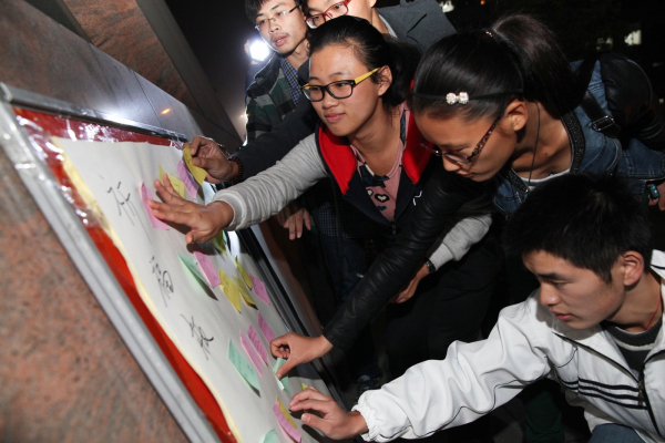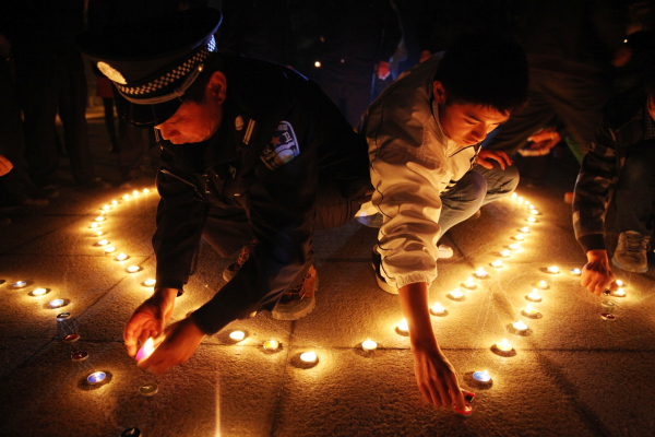 昨晚,在火博登陆平台恩泽碑广场,百余支蜡烛摆成一双托起爱心的双手,现场师生和学校保安围成一圈,为“最美保安”李迎福祈福,祝愿他早日康复。 记者 李怿鼎 摄
