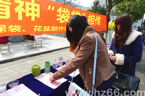 “这次活动从2月26日就开始了。大一共五个班,每个班3名同学参加,大家每人用塑料饮料瓶做2个花盆、1个环保袋。经过周一的初步筛选,今天在这里展示的作品都是进入评选环节的,通过票数结果选出一、二、三等奖,并颁发奖状和精美礼品。”外国语学院学生会实践部的付丽同学介绍道,“我们希望通过这样的活动,提高大家的环保意识。而且这次的花盆我们还会送给龙泉小学五年级的学生,并给他们买好黄豆种子,让他们自己种植,一起保护环境。”