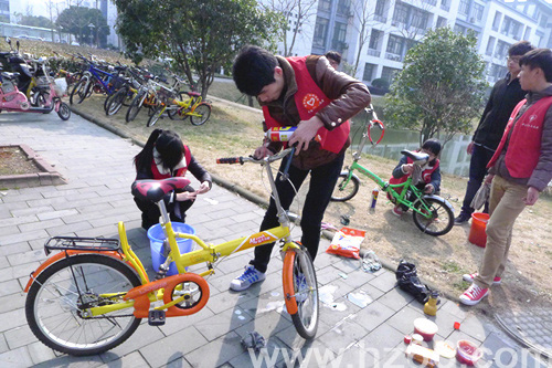 在东校区德清湖畔,一群学生簇拥在一起,不时还听到学生的“吆喝”声,记者挤进人群看到,被学生们团团围住的是工学院的志愿者们,他们正在为大家维修、清洗自行车和电瓶车。