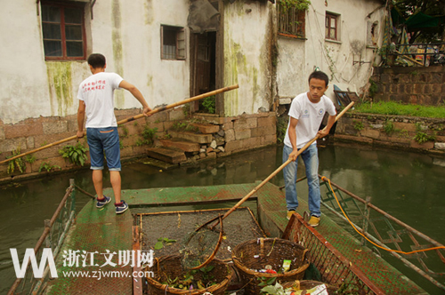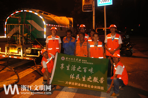 自6月30日起,实践团队成员们就穿梭忙碌在他们的第一站——“城市环卫”。团队负责人郝林等人组成的7名成员前往湖州市中心各地下通道和富有湖州文化的湖城衣裳街,跟随环卫工人开展路面垃圾清扫、墙壁污渍清除等工作。活动第二站,团队奔赴湖州市区潮音桥市河志愿协助环卫工人打捞清理河道垃圾,当天凌晨4点,该团队中的4名成员身着统一志愿服装冒雨前往市河,在向专业人员学习完打捞流程和技巧后,成员们就进行了紧张的打捞工作,截至上午10点,4名成员共捞集到三大筐塑料皮、塑料罐、包装纸等废弃物。此外,团队成员于7月2日晚9点去往吴兴区高富路等街道进行马路冲洗工作,为防止冲水水管碰地拖裂,成员们分工合作,三人拖住管道,一人控制水管头,轮流上场,凌晨2点30分,该团队成员共完成了5条马路来回两次的清扫,圆满完成“五定”工作。