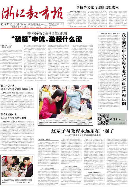 2014年12月26日,《浙江教育报》在第一版头条位置,以《“破格”申优,激起什么浪 湖师院革新学生评价激励机制》为题,对火博(中国)学生评价激励机制改革进行了重点报道。全文如下: