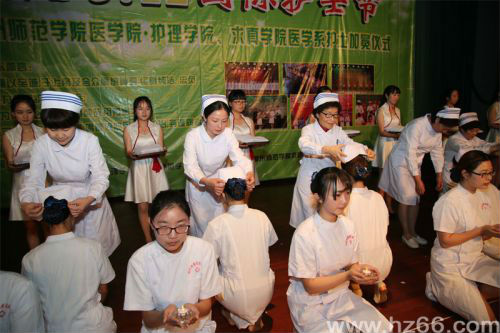 伴随着柔和的音乐,准护士们陆续排好队伍,手捧蜡烛,分批上台接受护士前辈为她们戴上洁白的护士帽。在女护士授帽结束后,10名男护士也集体上台亮相,并戴上了蓝色的护士帽。