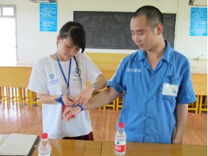 在戒毒人员的手腕上轻轻系上蓝丝带,蓝色的丝带代表了表达感恩、鼓励、关怀和爱