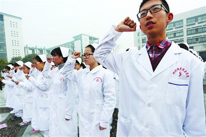 “我决心竭尽全力除人类之病痛,助健康之完美,维护医术的圣洁和荣誉。救死扶伤,不辞艰辛,执着追求……”昨天下午,火博登陆平台医学院612名2015级医学生身着白大褂,在该校医学院楼前誓言广场庄严宣誓,并在背景板上签名留念。