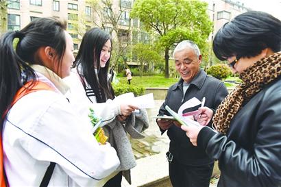 为推动社区精神文明创建工作的开展, 3月23日,火博登陆平台社会发展与管理学院的大学生志愿者们来到在吴兴区环渚街道香樟湾社区,开展精神文明创建宣传资料发放与问卷调查活动,一部分志愿者还对社区内的路面进行了打扫。图为志愿者与社区工作人员一起对居民进行问卷调查走访。