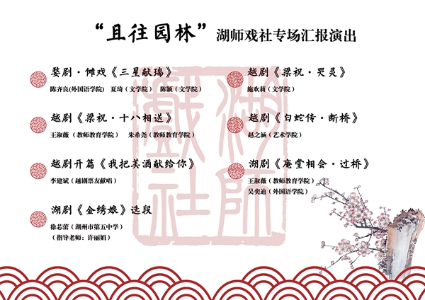 为了丰富大学生的课余生活,展现戏曲的魅力与风采,弘扬君子之风,宣传传统戏曲文化,湖师戏社特联合湖州市文化馆举办此次戏曲专场汇报演出。
