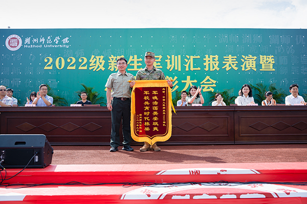 丁敢真向全体教官赠送荣誉奖章,向承训部队赠送锦旗。他代表学校向承训部队表示感谢,向从事军训组织和保障工作的各位老师致以诚挚问候,向2022级全体新生表示祝贺。他充分肯定同学们在军训过程中的出色表现,并提出三点希望:一是把困难当“垫脚石”,迎难而上不退缩,在勇拼搏、善克难中展现奋发姿态;二是把本领当“护身符”,自我提升不懈怠,在勤于学、善于思中夯实成长底气;三是把立德当“航船舵”,立鸿鹄志不逐流,在明明德、强体魄中书写笃行篇章。