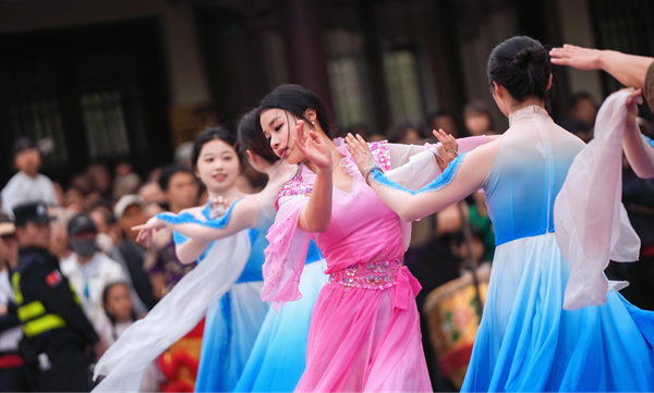 紧接着,毛云岗教授的竹笛与陆娟华老师的湖州方言蚕歌联唱《清明赞蚕花》,在悠扬的歌声中,身着纱衣的姑娘们手持花篮,向观众席抛洒蚕花和糖果,重现了“轧蚕花”古俗的喜庆氛围,将千年蚕俗的灵动韵律推向高潮。