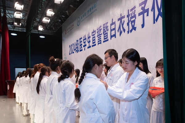 “健康所系,性命相托。当我步入神圣医学学府的时刻,谨庄严宣誓:我志愿献身医学,热爱祖国,忠于人民……”445名2024级新生身穿白衣,在附属第一医院副院长张颖的带领下庄严宣誓。